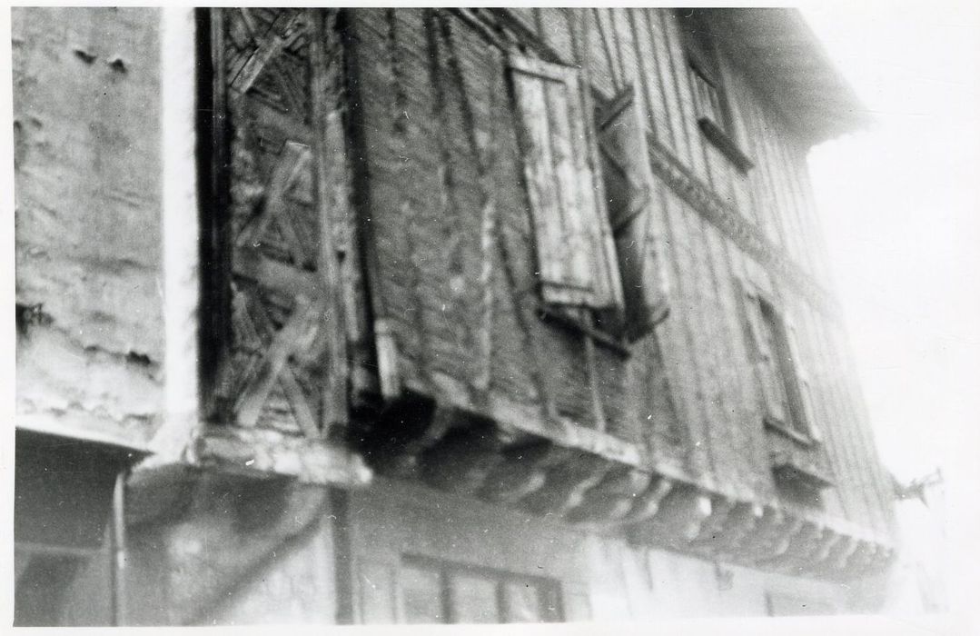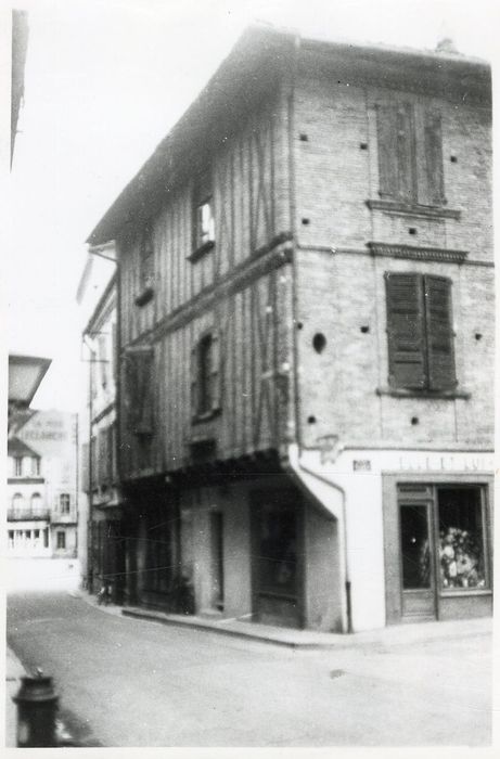 Immeuble rectangulaire avec une façade principale en encorbellement. Toutes les poutrelles qui supportent l'encorbellement du premier étage sont décorées de moulures mais suivant deux types différents, correspondant sans doute à une ancienne réparation. Un premier type est profilé de deux quarts-de-rond, chacun avec listel. Le second type comprend trois boudins profilés en amande, raccordés entre eux par des gorges. Supporté par des poutrelles, le pan de bois s'élève verticalement sur deux étages, sans nouvelle saillie à la base du deuxième. Entre ces deux niveaux, les sablières, encadrant les embouts des sommiers, dessinent un double bandeau horizontal. Les panneaux du pan de bois sont constitués alternativement par des croix de Saint-André et des panneaux rectangulaires à armature verticale médiane. Toutes les briques sont disposées par lits horizontaux. Les rares fenêtres s'inserrent dans le colombage. A l'extrémité gauche de cette façade, l'angle a été renforcé par un pan de bois constitué par une série de panneaux en croix de Saint-André. Si les moulurations des poutrelles sont gothiques, la construction n'est probablement pas antérieure au 16e siècle.