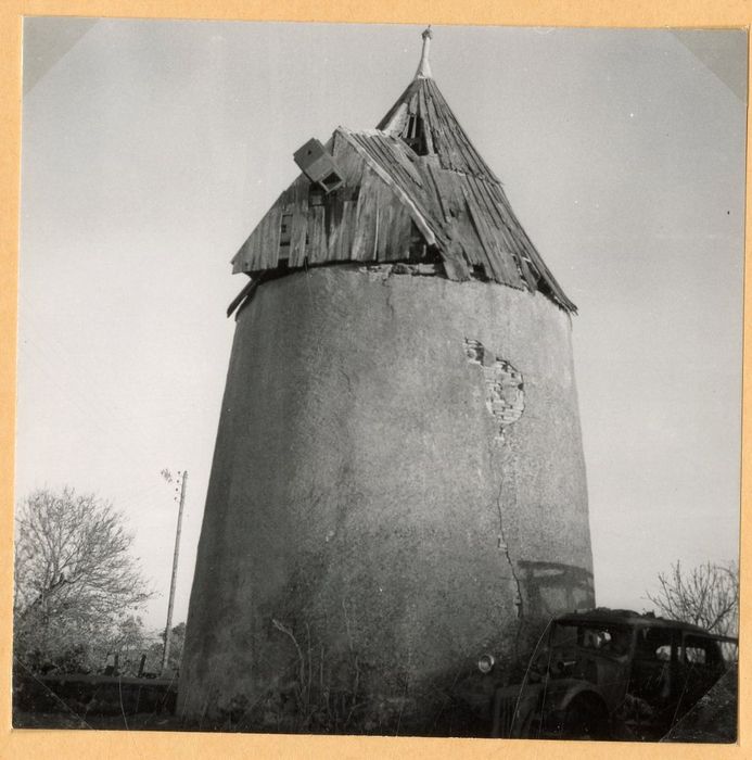 Connue aussi sous le nom de moulin de Saint-Angel, cette tour tronconique sur butte artificielle, construite en brique avec de rares assises en pierre, portait l'inscription "achetté en 1759", gravée sur une brique scellée au dessus de la porte d'entrée. Cette date, aujourd'hui disparue, est rappelée par un écriteau à l'intérieur de la salle en rez-de-chaussée surélevé, équipée de deux paires de meules. Jadis une paire de meules était située à l'étage, comme en témoignent les empreintes de l'escalier suspendu laissées dans la maçonnerie et les ouvertures. Vers 1940, un moteur à essence remplace l'énergie éolienne. Le moulin cesse son activité quelques années plus tard en 1951 ; la toiture et les ailes sont refaites en 1979. Ce moulin a été consolidé à sa base par un cerclage en fer, après la tempête de décembre 1999.