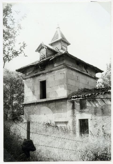 Pigeonnier sans doute du 17e siècle, de plan carré, élevé sur arcades. Chacune des quatre piles d'angle, de section carrée, se termine par une imposte moulurée, à la retombée de l'arc. L'étage délimité par deux rebords de protection est percé d'une fenêtre rectangulaire à l'est. Deux mansardes servent d'accès aux pigeons, au midi et à l'est. Au-dessus, un lanternon carré, couvert d'un toit à quatre pans, constitue une seconde entrée pour les pigeons. Il est lui-même surmonté d'un faitage de pierre à bulbe. Murs en "opus quadratum".