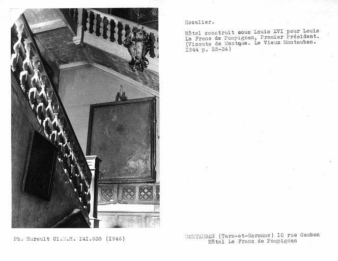 Bâtiment construit pour Le Franc de Pompignan, premier président de la cour des aides, dans la seconde moitié du 17e siècle. Il est constitué par des bâtiments en fer à cheval ouvrant sur la rue par un large portail d'ordre classique.