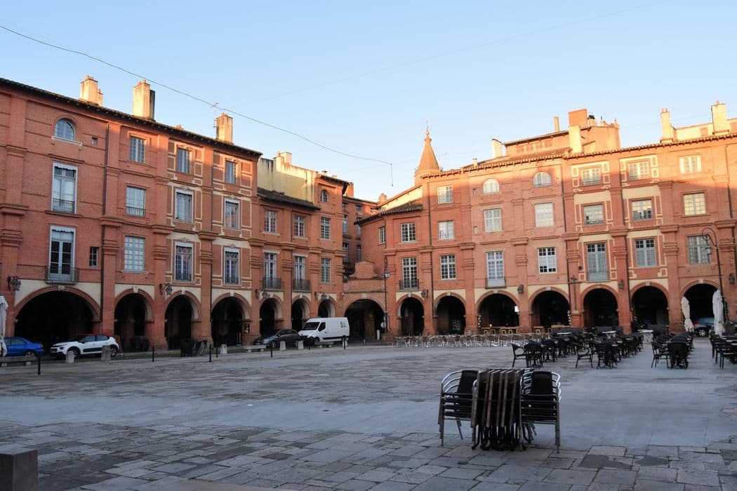 La place Nationale constitue un intéressant ensemble de maisons dont le rez-de-chaussée forme une double galerie voûtée sur croisées d'ogives et dont les trois étages sont divisés par des ordonnances régulières, sauf au troisième étage où les baies sont les unes rectangulaires, les autres circulaires. Quelques-unes de ces maisons portent les dates de 1516 et 1556. La construction de cette place est due à l'architecte toulousain Pierre Besneville. Toute la construction est en briques, à l'exception des clefs des arcs, des voûtes et des appuis de fenêtres.