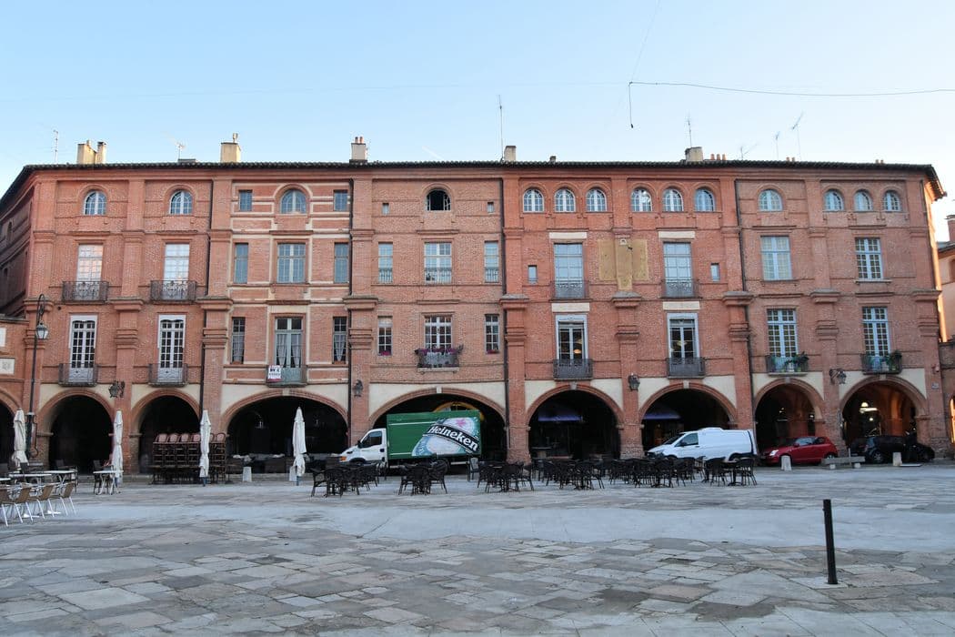 La place Nationale constitue un intéressant ensemble de maisons dont le rez-de-chaussée forme une double galerie voûtée sur croisées d'ogives et dont les trois étages sont divisés par des ordonnances régulières, sauf au troisième étage où les baies sont les unes rectangulaires, les autres circulaires. Quelques-unes de ces maisons portent les dates de 1516 et 1556. La construction de cette place est due à l'architecte toulousain Pierre Besneville. Toute la construction est en briques, à l'exception des clefs des arcs, des voûtes et des appuis de fenêtres.