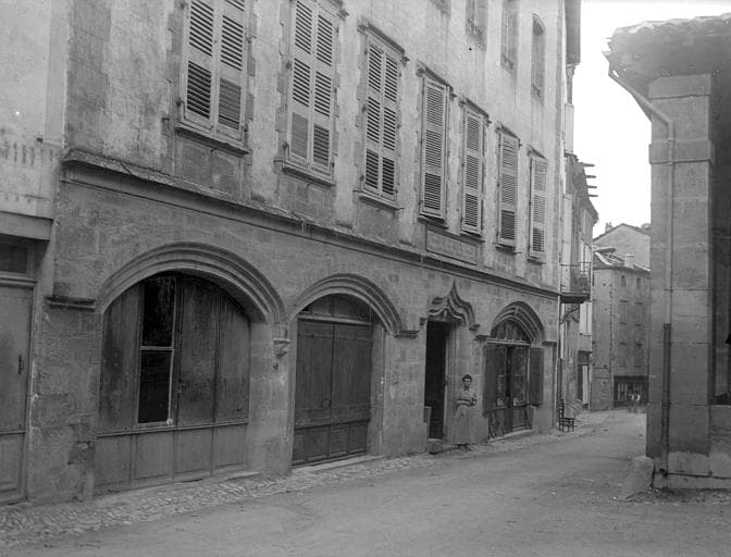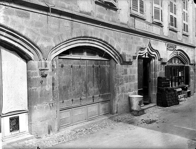 La façade est percée, au rez-de-chaussée (15e siècle) sur rue, d'une porte et de larges arcades surbaissées et moulurées, constituant un intéressant exemple de façade d'immeuble à usage commercial. Sur cour, la façade est percée de deux portes. Le linteau gothique flamboyant a été supprimé. Le travail de taille de pierre est orné d'abondantes moulures et accosté de pinacles sculptés. Dans la même cour, une autre porte est surmontée d'un écusson soutenu par deux monstres à têtes humaines et pieds de griffons, et entouré de guirlande.