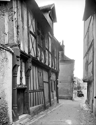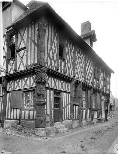 Maison construite en torchis et en bois. Le rez-de-chaussée s'ouvre par une porte en anse de panier avec montants de bois sculptés. Fenêtres à meneaux.