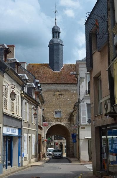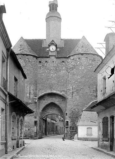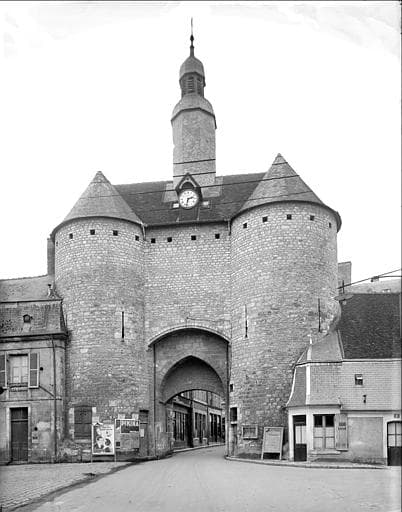 Au 13e siècle, la ville était entourée d'une enceinte fortifiée qui s'ouvrait par deux portes. La porte de l'Horloge, la seule subsistante, a subi quelques modifications dans le courant du 18e siècle. Le lanternon, probablement ajouté à la même époque, contient une cloche en bronze, fondue par le duc Jean de Berry en 1394. L'ouvrage est en pierre de taille et moellon de calcaire. La charpente en chêne se compose de chevrons formant ferme et de deux fermes principales.