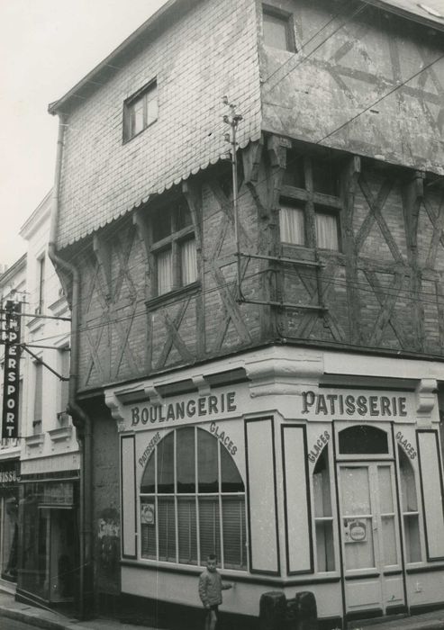 Maison d'angle, à pans de bois à croisillons, garnis de briquetage. Il y a onze rangées de croisillons par étage. Chacun de ces étages est en encorbellement et saillant. L'encorbellement du premier est supporté par des consoles de pierre faites de trois corbeaux en quart de rond superposés. A l'étage supérieur, les consoles sont en bois et placées comme des jambes de force. La charpente a été modifiée, ainsi que la pente et son bris. Elle est sur pannes et non sur chevron faisant ferme. Plusieurs fenêtres sont à croisées de bois. L'une d'entre elles a conservé son appui sculpté et mouluré.