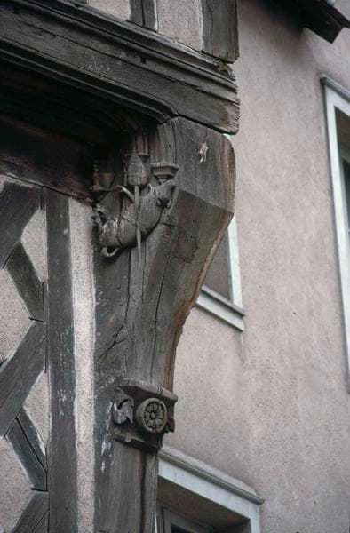 Edifice du début du 16e siècle, ayant subi d'importantes transformations par la suite, en particulier à l'intérieur. Comportant deux encorbellements au niveau des deux étages, la façade est construite en pans de bois garnis d'un remplissage en petits éléments calcaire et mortier de terre. Certaines suppressions de poteaux, meneaux et traverses de baies ont quelque peu modifié l'aspect primitif de cet immeuble. La façade s'orne de mouluration et de nombreux motifs sculptés, dont un grand poisson sur l'un des liens-consoles du rez-de-chaussée.