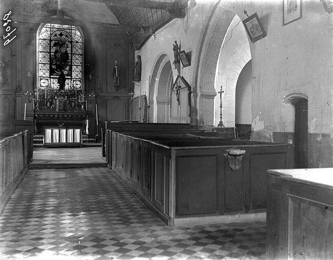 L'église se compose d'une nef du 12e siècle terminée par un choeur plat, d'un bas-côté remanié au 16e siècle et d'un clocher latéral sud du 15e siècle. La nef est percée de fenêtres remaniées aux 17e et 18e siècles, sauf deux petites baies qui ont conservé leur forme ancienne. Un berceau en bois du 15e siècle avec entraits, poinçons et sablières moulurées et sculptées, la recouvre sur toute sa longueur. Une partie du lambrissage a été remplacée à une époque récente par de simples frises sans couvre-joint. Le bas-côté sud est formé par deux travées s'ouvrant sur le choeur par deux arcs du 12e siècle à rouleaux, à ressauts chanfreinés et tailloirs moulurés. Sur la première travée de ce bas-côté, a été élevé au 15e siècle un clocher carré flanqué d'une tourelle d'escalier polygonale. La partie supérieure en charpente présente, sur trois faces, trois lucarnes recouvertes d'ardoise. La tourelle d'escalier se termine par une galerie à jour également en charpente, surmontée d'un campanile.