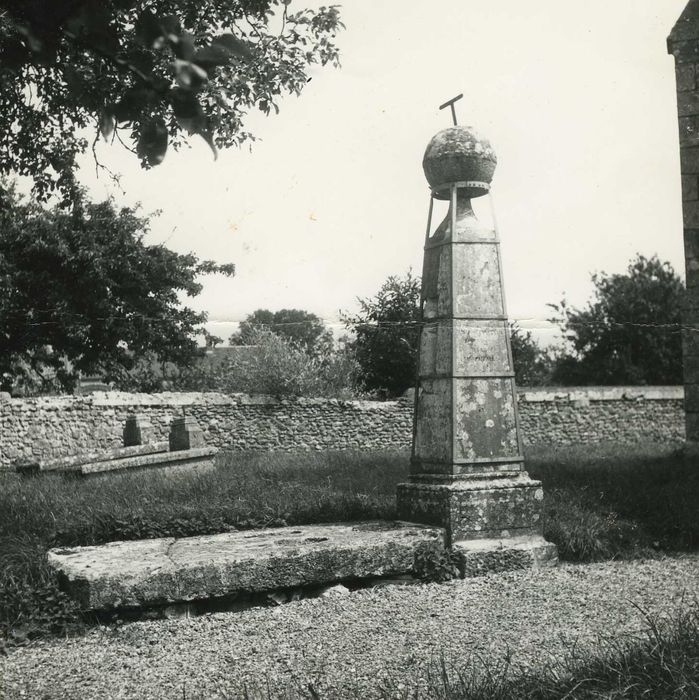 Mausolée érigé en 1733, en l'honneur de Nicolas de Malebranche. Nicolas de Malebranche avait acquis une notoriété avec la publication, en 1674, du premier volume de La Recherche de la Vérité, et est resté célèbre comme physicien et philosophe. En 1792 ou 1793, le monument érigé dans le cimetière du Mesnil-Simon fut détruit et les pierres employées à divers usages. La pyramide servit de support à une pierre employée à former un ponceau sur un ravin. En 1839, la pyramide, sa base et le globe avec attributs de la science furent retrouvés. La pyramide, trop altérée, fut refaite et les inscriptions relatant la vie et l'oeuvre de Malebranche reproduites. Le monument reconstitué fut replacé sur la tombe de la famille la même année.