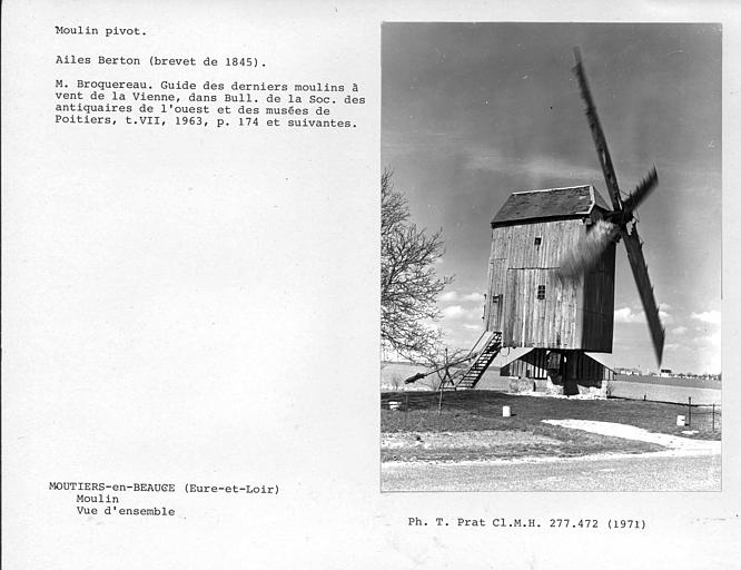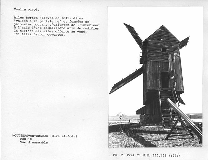 Moulin de type beauceron archaïque, sans tourelle de base en maçonnerie, monté sur un pivot soutenu par quatre étais qui reposent eux-mêmes sur des blocs de pierre. Le moulin pivote pour prendre le vent au moyen d'une queue, tige de bois fixée à sa base, poussée à bras d'homme sur l'aire circulaire qui entoure le bâtiment. Celui-ci est une tour de bois rectangulaire, faite de bardages verticaux, et surmontée d'un toit à deux pentes. Les ailes ne sont plus équipées en toile, mais à pales en bois articulées, actionnées de l'intérieur. Le moulin comporte deux étages. L'accès à l'étage inférieur se fait par un escalier de bois solidaire de la queue. Cet étage sert de magasin. Une échelle et une trappe permettent de monter au second étage qui renferme tout le mécanisme. Tout le système est en chêne, y compris les engrenages, les axes, les pivots, le frein des ailes.