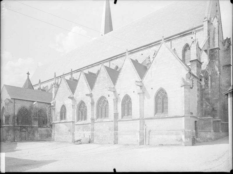 D'après la tradition, la fondation de l'édifice remonterait à 850. Incendiée en 1135, l'église fut reconstruite sur un plan monumental. En 1354, après avoir repris la ville, les Anglais incendient l'église dont six travées s'écroulèrent. Elles furent reconstruites à la fin du 14e siècle et de nombreuses chapelles y furent ajoutées au 15e et au début du 16e siècle. En 1651, l'église fut à nouveau incendiée par Condé. Les quatre travées de la nef, couvertes en bois, restes de l'église du 12e siècle, sont détruites. En 1872, le curé entreprit de reconstruire ces travées dans le style de l'église du 15e siècle, avec le concours de l'architecte Tarlier. Seules six travées de nef construite de 1354 à 1400 subsistent. La nef se termine par un chevet plat.