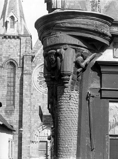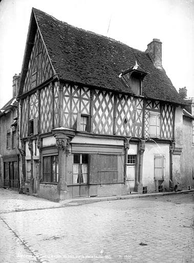Cette maison est à pans de bois sur mur bahut avec pignon arrière en pierre. Elle a perdu sa tourelle d'angle. Les pans de bois sont ornés de sculptures. Un poteau cormier avec trois figures, quatre autres poteaux avec des angelots porteurs d'armoiries, décorent le rez-de-chaussée. Au premier étage, entre les remplissages en croix de Saint-André, sont des poteaux avec bases, chapiteaux et bagues.