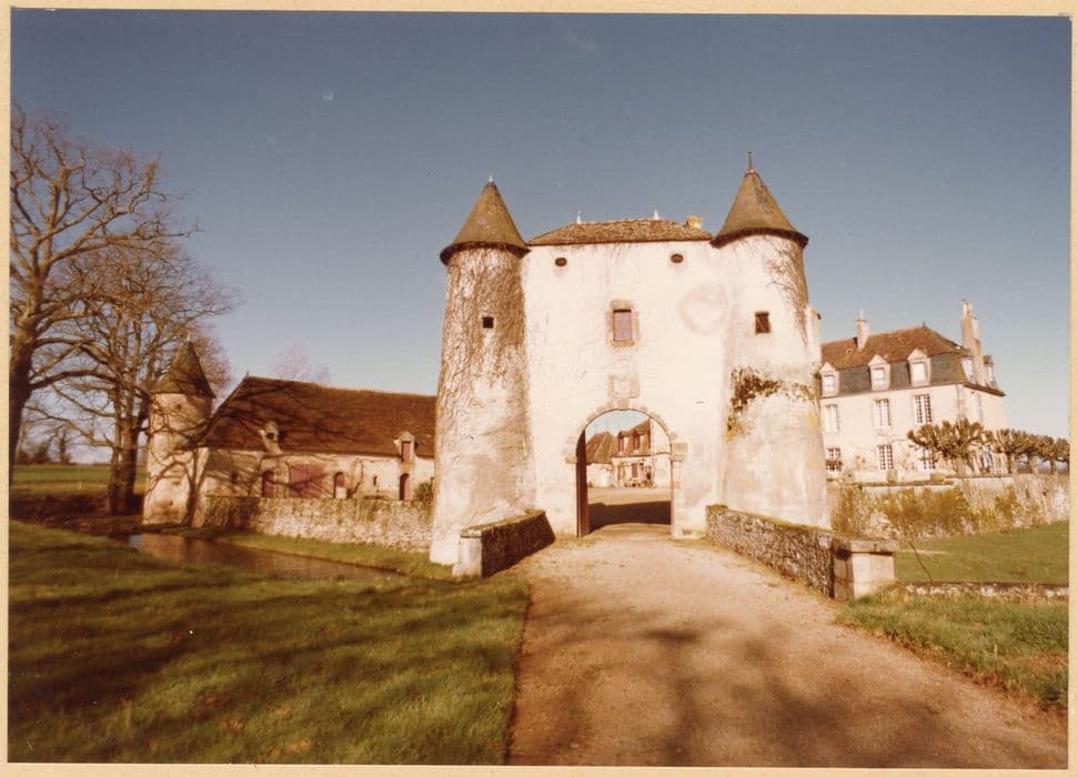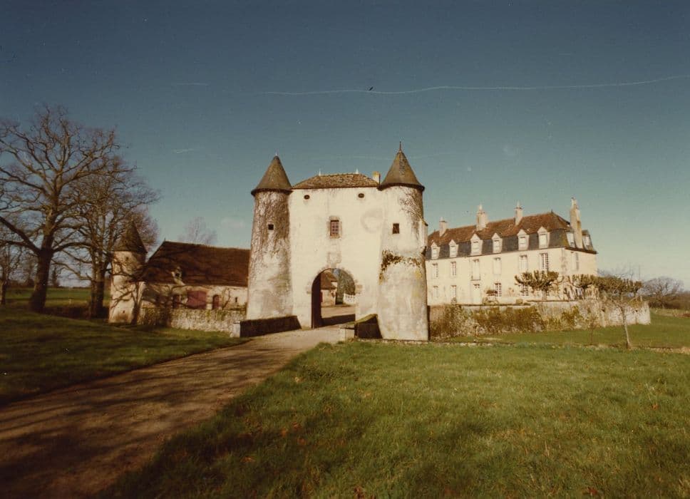 Le fief date au moins du 12e siècle. Le château est un long corps de logis du 18e siècle, à un étage, percé de sept rangées d'ouvertures. La poterne du 15e siècle est flanquée de deux petites tours un peu coniques. De l'enceinte primitive subsistent également à l'est deux petites tours rondes qui en marquaient les angles. La chapelle est située à l'est. Les communs sont de longs bâtiments bas d'architecture rurale dont les hautes toitures évoquent le 16e ou le 17e siècle.