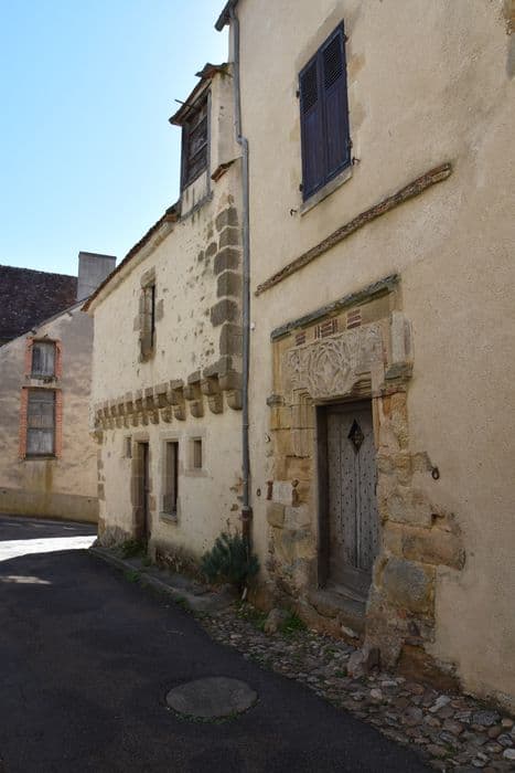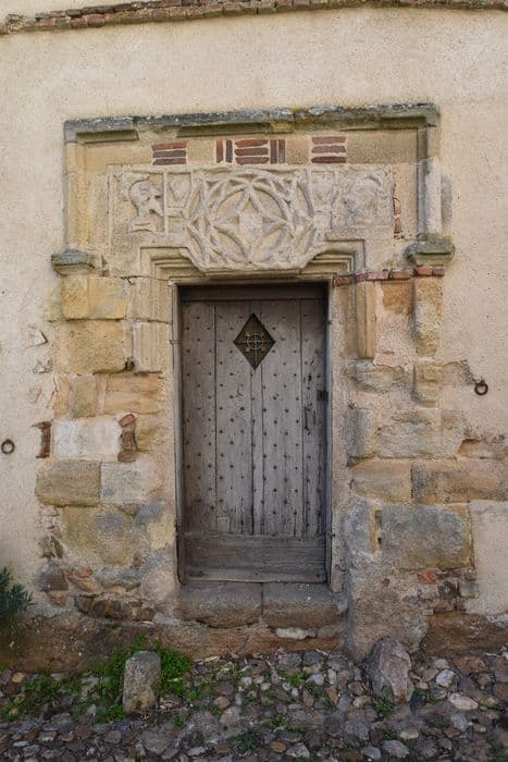 La maison s'ouvre par un portail sculpté, très mutilé à la base. Le linteau, de dimension inusitée, est un travail assez grossier de la fin du 15e siècle, peut-être du 16e, paraissant d'avantage l'oeuvre d'un tailleur de pierre que d'un artiste. Il se compose d'une rosace géométrique avec, de chaque côté, deux têtes de femmes coiffées de bonnets pointus. Au centre, un écusson sans armoiries.