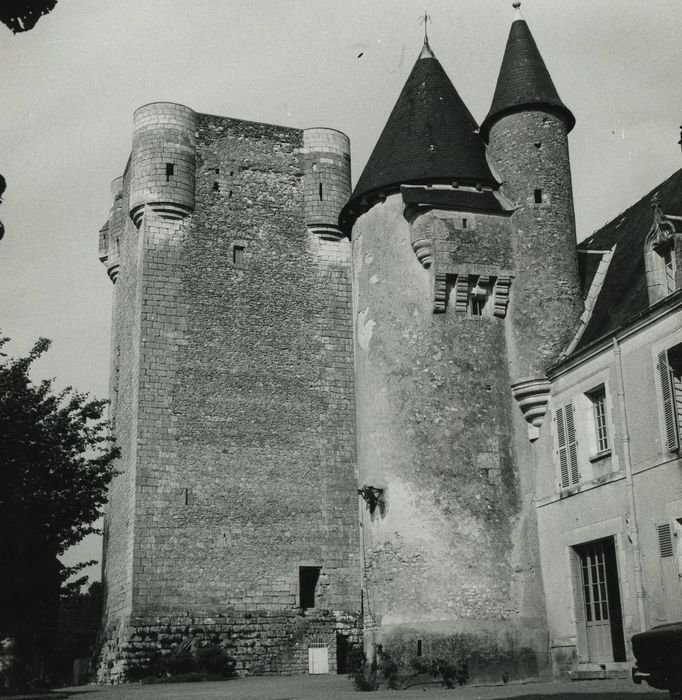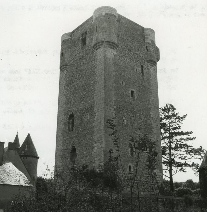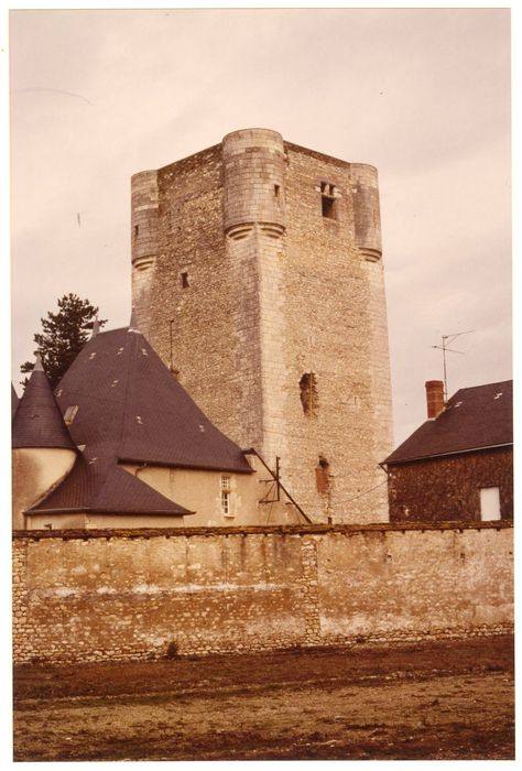 Donjon ; tour circulaire qui flanque la façade Ouest du corps de logis ; sol correspondant à l'ancienne assiette foncière du château (cad. E 148, 149) : inscription par arrêté du 5 avril 1988