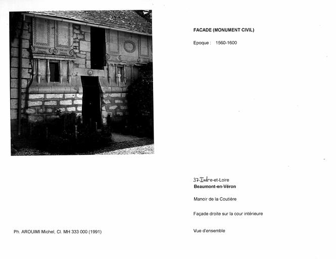Ancienne ferme dépendant du prieuré de Beaumont-en-Véron. Cette ferme conserve un portail d'entrée surmonté d'une galerie qui devait limiter un chemin de ronde, et quelques vestiges de façades sur la cour présentant une décoration originale de pilastres et motifs sculptés. Ces parties, qui appartiennent au 16e siècle, peuvent être soit les vestiges d'un ensemble aujourd'hui démoli, soit les prémices d'une ferme somptueuse dont la construction a été abandonnée en cours d'exécution. Au nord-est de la cour se trouvent les restes de l'ancienne chapelle.