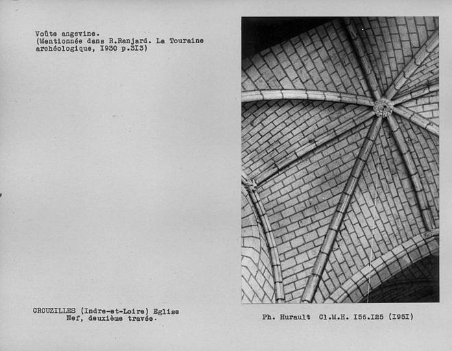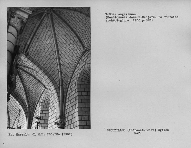 Les murs goutterots de la nef ont été surélevés au 13e siècle, lors de la construction des trois travées de voûtes angevines. Au nord, la nef est accompagnée d'une galerie couverte en appentis, qui ouvrait sur l'extérieur par quatre arcades. Le transept a sa croisée limitée par quatre arcades brisées. Le croisillon nord est accompagné d'une absidiole semi circulaire voûtée en cul de four. L'absidiole du croisillon sud a été reconstruite au 16e siècle, sur pla carré, avec voûte d'ogives. Le choeur a été revoûté au 16e siècle. L'abside à cinq pans en est séparée par une arcade dont les supports sont des colonnes engagées du 12e siècle. Au-dessus du carré du transept, le clocher est réduit à un soubassement dont chaque face est décorée d'une arcature aveugle.