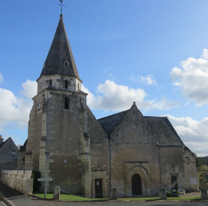 L'église appartenait primitivement au chapitre d'Orléans qui le vendit, au 11e siècle, à l'abbaye de Saint-Julien. Un prieuré lui fut ajouté, qui fut cédé un peu plus tard à l'abbaye de Beaulieu. L'édifice carré se compose d'une nef romane, primitivement unique, et de collatéraux faits de chapelles contigües datant, au sud, du 15e siècle, et au nord, du 16e siècle. Le chevet plat est percé de trois fenêtres datant de l'époque primitive. Du côté nord se trouve une tour carrée qui soutient le clocher. Une flèche octogonale se pose sur un étage intermédiaire à huit pans.