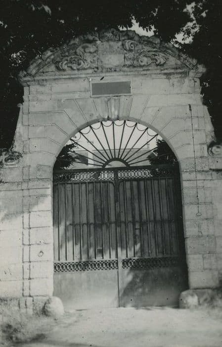 Le parc est doté d'une porte monumentale à l'ouest. Le petit château actuel a du être reconstruit à la fin du 18e ou au début du 19e siècle. La porte en plein cintre menant au parc est ouverte dans une architecture accostée de pilastres et d'ailerons, et amortie par un fronton courbe. Sous une grille d'imposte soulignée par une traverse en fer à entrelacs, les deux vantaux se composent d'une grille dans leur deux tiers supérieurs, séparée par une traverse à entrelacs d'un panneau plein inférieur.