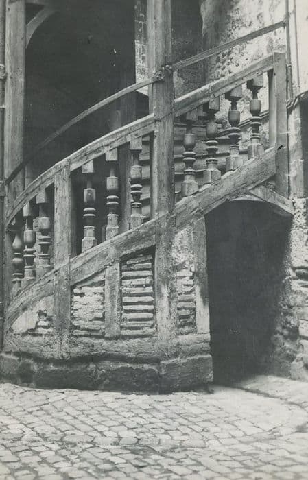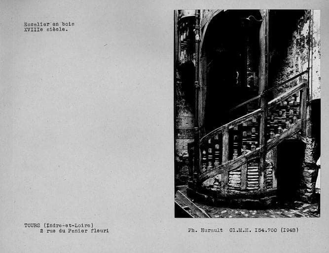 Cet escalier est placé dans l'angle nord-ouest d'une petite cour qui fut celle de l'ancienne hôtellerie à l'enseigne du Panier Fleury, comme l'indique encore sur la façade de l'immeuble, un panier rempli de fleurs sculpté sur la muraille. Il est appuyé à deux façades dont celle du nord est plus ancienne, datant du 15e siècle. L'escalier hélicoïdal, avec palier à chaque étage, est garni de balustres moulurés. Un étroit passage circulant sous la travée inférieure, relie la cour au couloir conduisant à la rue, et permet l'écoulement des eaux évacuées par le caniveau de cette cour.