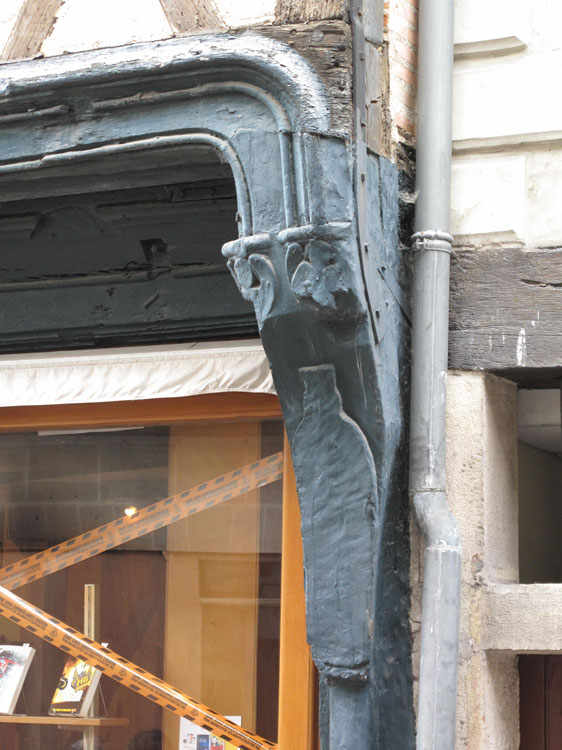 Maison élevée d'un rez-de-chaussée et de trois étages dont le dernier est dans le comble. Les poteaux corniers subsistent, dont certains ont conservé leur décoration par des têtes d'angelots.