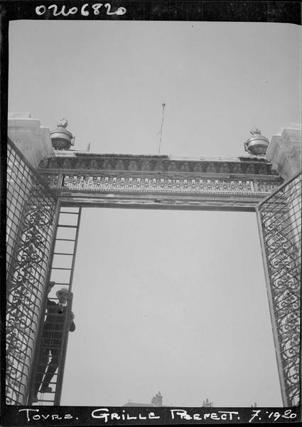L'actuelle grille d'honneur en fer forgé de la Préfecture provient de l'ancienne abbaye de Beaumont-les-Tours (1785). Elle se compose de panneaux en manière de grillage, formé de fers ronds se pénétrant et assemblés à trous renflés, qu'encadrent, sur un soubassement à balustres, des montants décorés et une corniche à carreaux, exécutés en fer forgé rehaussé d'ornements en bronze. Les boiseries du 18e siècle (vers 1759) du petit salon dit de Choiseul proviennent de l'ancienne Maison de l'Intendance à Tours.