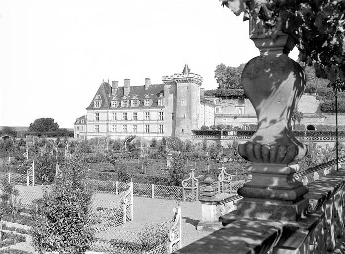 Château, sauf parties classées : inscription par arrêté du 12 avril 1927 - Façades, toitures, vestibule d'entrée, escalier intérieur et salle à manger du château ; façades et toitures du bâtiment du concierge, des communs, de la basse-cour et des deux pavillons du 18e siècle qui encadrent l'entrée du château ; façades et toitures du pavillon de l'Audience situé au bout de l'allée des Tilleuls ; cours, jardins, terrasses, pièces d'eau formant un ensemble limité au nord par la route de Tours, au sud par le chemin rural de la Bergerie, à l'ouest par le mur de clôture longeant le labyrinthe, la tonnelle et la basse-cour, à l'est par une ligne parallèle au mur de soutènement de la terrasse tracée à l'est et à 100 mètres de distance de ce mur : classement par arrêté du 4 septembre 1934