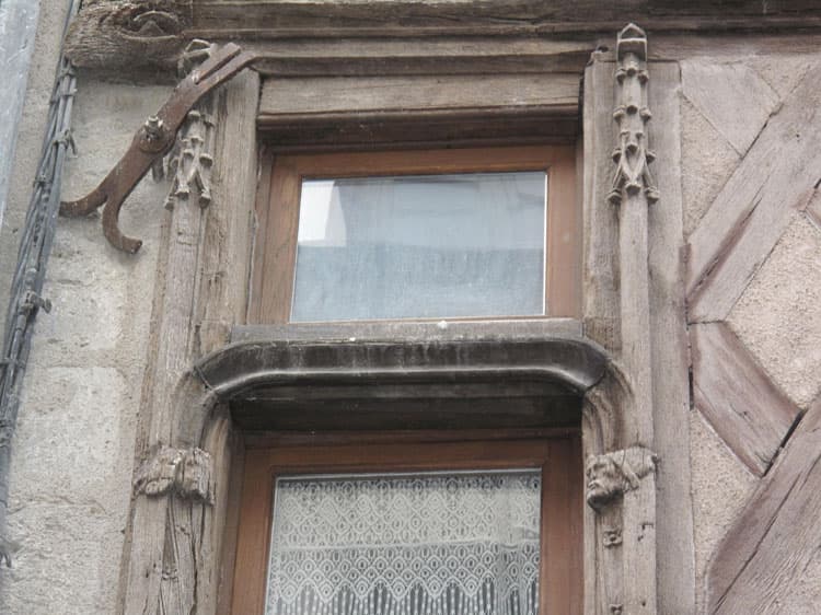Le rez-de-chaussée est en maçonnerie, le reste de la façade en pans de bois avec panneaux à grandes croix de Saint-André. A chaque étage, la fenêtre principale est encadrée de colonnettes en bois sculpté (chapiteaux à fleurons). Chaque étage est séparé par une frise en bois, celles du premier et du second étant sculptées aux extrémités. A l'intérieur se trouve un escalier à vis en bois, avec rampe moulurée.