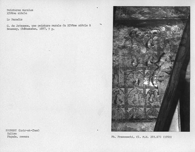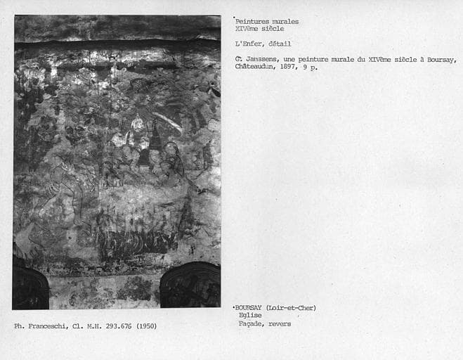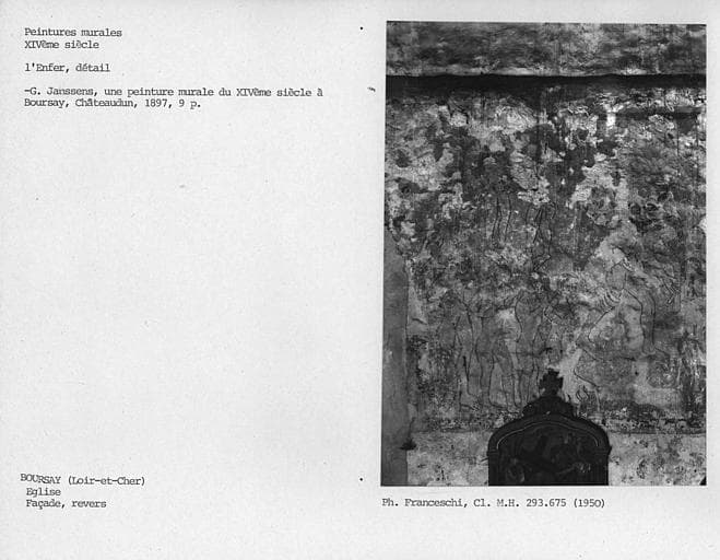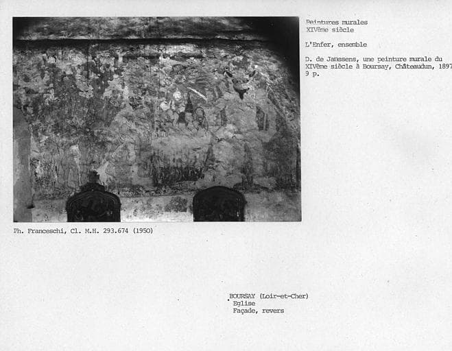 Cette église renferme des peintures murales du 14e siècle. Ces peintures ont été découvertes en 1895. Elles occupaient anciennement toute la largeur du mur occidental de la nef. La partie centrale a été détruite à la suite de la réfection de la porte. Le côté gauche représentait le paradis. Du buste du Christ, dans un médaillon trilobé, qui en occupait le centre, il n'existe plus qu'un fragment du nimbe crucifère. Le reste de la composition est divisé en compartiments rectangulaires enfermant chacun, dans la partie subsistante, une figure d'élue couronnée. A droite, l'enfer est représenté par une marmite dans laquelle sont plongés plusieurs personnages, dont un pape, un évêque, un moine, un roi, une reine. Au-dessus, une femme les jambes écartées. A droite, un énorme démon cornu tire la langue. A gauche, un autre porte une hotte remplie de damnés et s'apprête à plonger une femme dans la chaudière.