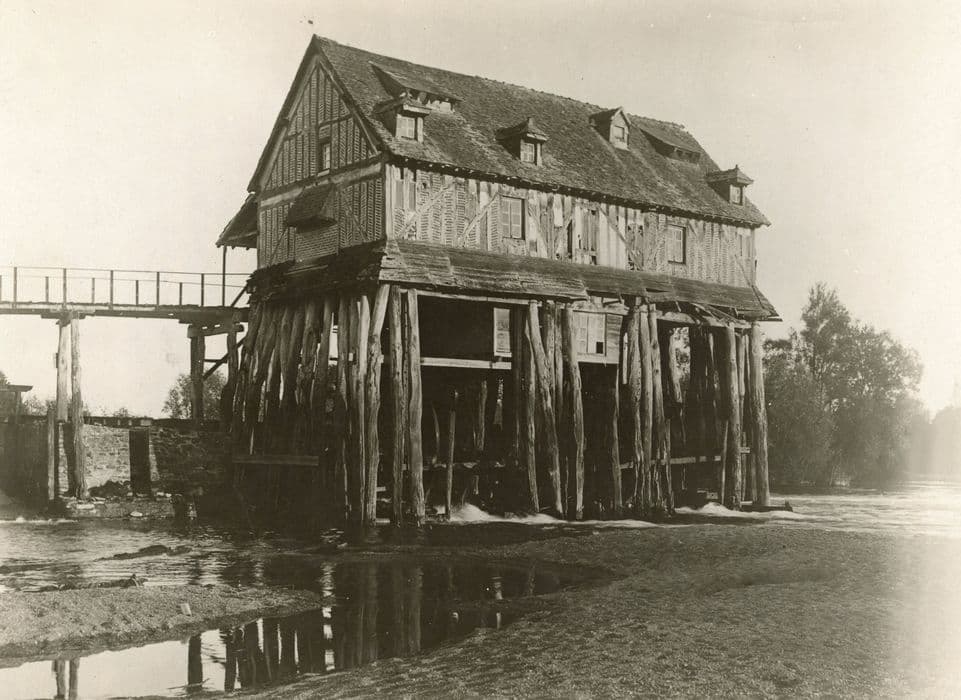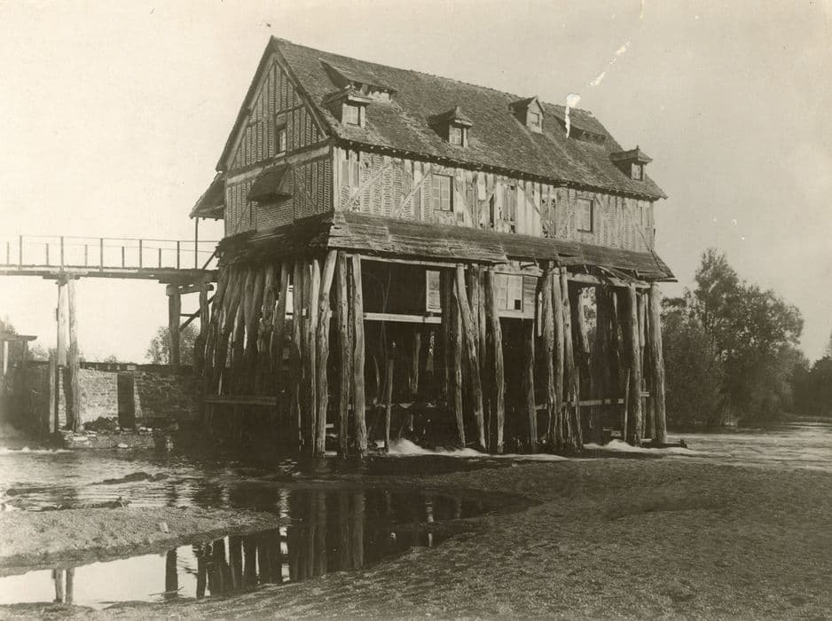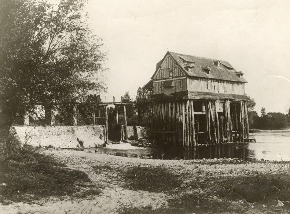 Le moulin aurait été bâti au 16e siècle. Il se composait d'un grand bâtiment rectangulaire, de quinze mètres de long sur sept de large, porté sur des pilotis. Il était relié à la rive droite de la rivière par une passerelle, également sur pilotis. Un comble à deux pentes le couvrait, avec pignon sur chacun des petits côtés. Les roues à aubes se trouvaient entre les pilotis, et pouvaient être élevées ou abaissées selon le niveau du Cher. Au-dessus, dans le bâtiment construit en pan de bois avec remplissages de briques, avaient été disposés les locaux d'habitation et de mouture. Le moulin a été utilisé jusque dans les années 1910. Probablement effondré entre 1950 et 1951.