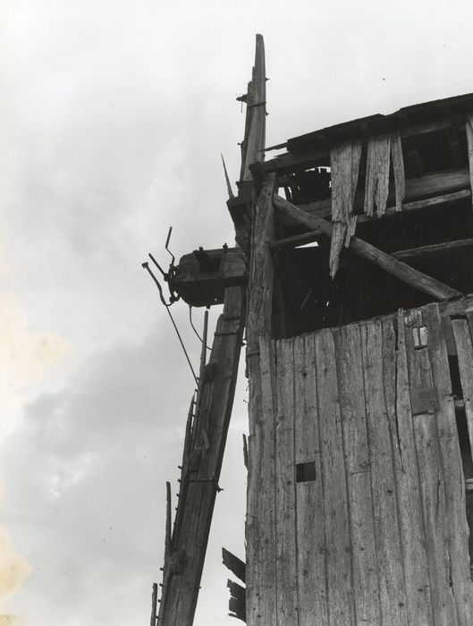 Moulin en bois de forme prismatique rectangulaire, sommé d'une toiture à double pente. Il est bardé en planches de chêne. La couverture est en petites ardoises et le faîtage en zinc. Le support comprend le pilier axial portant le plateau de base. Il est flanqué au sol de quatre faux pieds. La queue du moulin existe encore. Des quatre ailes en restent deux. A l'intérieur, sont conservés en bonne état transmissions, meules et mécanismes.
