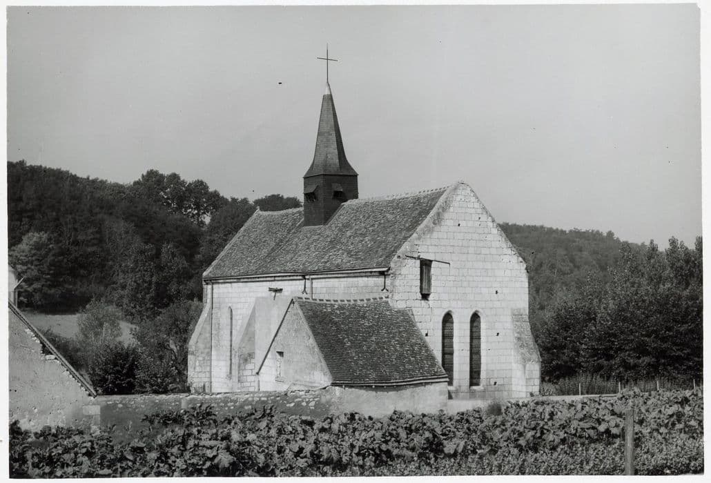 Eglise à nef unique, terminée par un chevet plat de style gothique angevin. La nef est couverte par trois travées de voûtes bombées à huit nervures, retombant sur des groupes de trois colonnettes à chapiteaux sculptés.