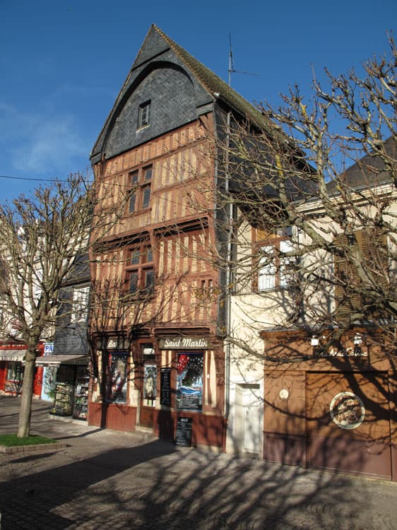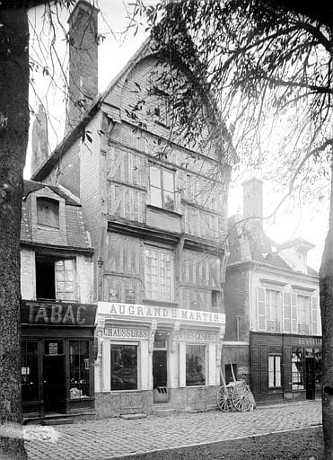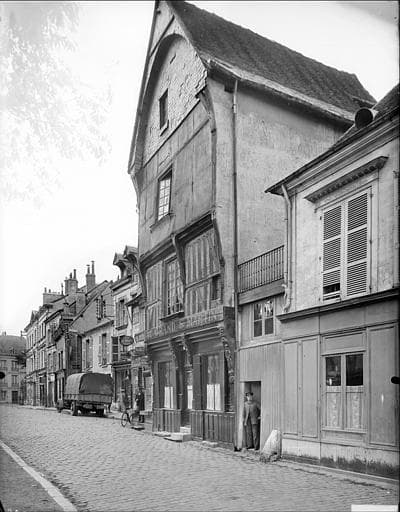 Maison avec façade à pans de bois, de la fin du 15e siècle ou du début du 16e. Elle présente trois étages surmontés d'un pignon dont la ferme extérieure de charpente, en saillie, a ses jambettes et aisseliers portés par des liens. Aux premier et second étages, poteaux, traverses, sablières et liens sont moulurés de profils indiquant l'époque de la construction. Le deuxième étage est en encorbellement sur le premier, lequel l'est également sur le rez-de-chaussée. Entre les bois, les vides sonts remplis de briques apparentes. Les liens du rez-de-chaussée sont sculptés, représentant Saint-Louis portant un écusson, Saint-Jean-Baptiste, Saint-Nicolas et Saint-Martin.