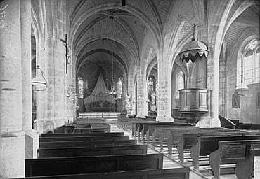 Eglise du 16e siècle, présentant un plan régulier à trois nefs qui n'a pas été modifié, ainsi que l'intérieur. Doubleaux et nervures retombent sans chapiteaux, en pénétration, sur les points d'appui.