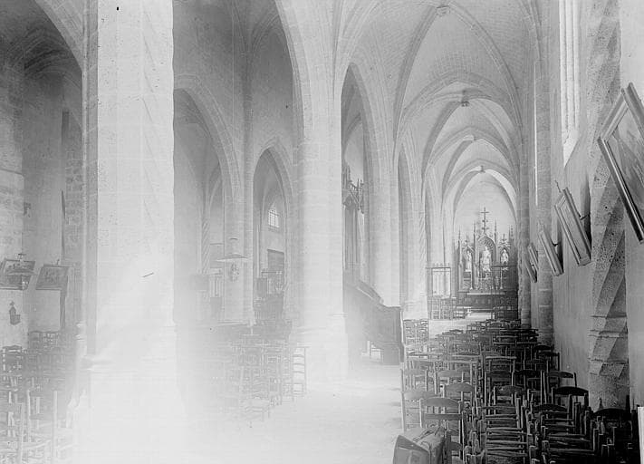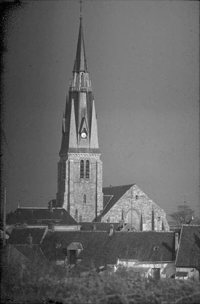 Eglise fortifiée construite au 13e siècle, qui dépendait de l'abbaye de Saint-Denis. Elle comportait primitivement huit travées. De cette époque datent la moitié de la crypte, la base du clocher, une fenêtre et la corniche replacée sur le mur sud. Brûlée vers 1427 par les Anglais, elle est rebâtie à la fin du 15e siècle. Le clocher était alors fortifié et l'entrée de la tour protégée par une herse dont se voient encore les coulisses. Le pont-levis a disparu. Des marches conduisent actuellement au seuil de l'ancienne porte et donnent accès au porche sous lequel sont conservées deux meurtrières. La crypte occupe toute la superficie du choeur et de ses bas-côtés. L'accès se fait par deux escaliers partant l'un de l'intérieur de l'église, l'autre de l'extérieur. La basse nef a été ajoutée sous le règne de François Ier.
