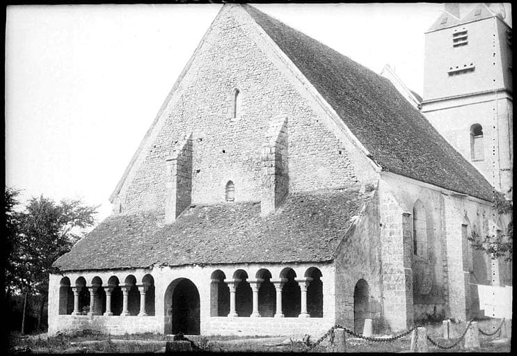 Cette église du diocèse de Sens appartenait au chapitre de Notre-Dame de Paris. Plusieurs parties de l'édifice remontent à l'époque romane, notamment les deux premiers étages de la tour du clocher. Des remaniements ont eu lieu aux 14e et 15e siècles. L'église se compose d'une nef avec bas-côtés, d'un transept et d'un choeur à chevet plat. Elle s'ouvre par un porche du 12e ou du 13e siècle. Il comprend onze arcatures en plein cintre supportées par des colonnettes aux chapiteaux ayant tous une ornementation différente. Une grande baie en plein cintre s'ouvrant au ras du sol le sépare en deux parties, l'une ouverte par cinq arcades et l'autre par six. Les colonnettes supportant les arcs reposent sur un bahut en maçonnerie. La grande baie servant d'entrée est placée face à la porte de l'église. A l'intérieur, autour d'une travée romane voûtée en berceau, paraissant contemporaine du porche et du portail d'entrée, s'élèvent, à l'ouest, trois travées avec profils et sculptures allant du 12e au 14e siècle ; à l'est, deux travées du 14e siècle formant le choeur. Les bas-côtés pourraient remonter au 13e siècle, hormis les deux travées accolées à la travée romane, qui sont du 15e siècle. L'une d'elles, au sud, comporte un oculus pour le passage des cloches et est surmontée d'un petit clocher.