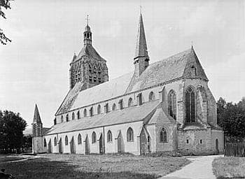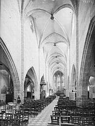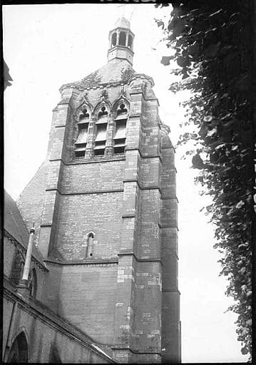 Eglise gothique sans transept, à trois nefs terminées par des absides polygonales. La grande nef compte sept travées voûtées en croisées d'ogives. La communication avec les bas-côtés est faite par de grandes arcades en arc brisé soutenues par de gros piliers polygonaux. Le bas-côté au sud comprend sept travées voûtées comme la nef. Celui du nord en a moins, la tour du clocher étant imbriquée à cet emplacement. L'abside et les absidioles sont voûtées sur de fines liernes et se divisent en sept pans. Une seconde flèche, en charpente octogonale, s'élève au-dessus de la seconde travée. Une petite tour polygonale, à la même hauteur, vient en saillie du mur gouttereau nord. Une autre tourelle existe au coin sud-ouest et est percée de meurtrières. La porte latérale nord est à gâble gothique. L'actuel édifice, oeuvre antérieure au 15e siècle, atteste, avec sa corniche à modillons, les caractères d'un édifice plus ancien, restauré après la guerre de Cent ans puis les guerres de Religion. La puissante tour du clocher, construite en 1494, avait servi à la défense. Elle était plus haute d'un tambour supportant une flèche de pierre, cantonné de quatre clochetons aux angles. Détruite en 1568, cette flèche fut rétablie en charpente de bois en 1572. Elle fut incendiée par la foudre en 1738. Les quatre clochetons furent supprimés en 1841.
