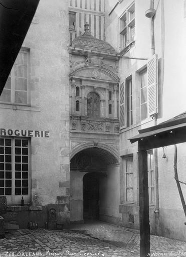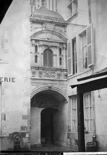 Au rez-de-chaussée, se trouve un passage à voûte très ornementée, supportant un petit cabinet en encorbellement dont la façade est ornée de quatre colonnettes portées par des consoles ornées de têtes et de feuillage. Une fenêtre centrale ouvre la paroi, ainsi que quatre petites baies. Sous l'appui de l'arc central, deux amours portent des armes. Le fronton au-dessus de l'entablement est orné d'un bas-relief, et surmonté d'un cartouche portant une inscription. La toiture est cintrée, en dôme à quatre pans. Elle est surmontée d'un poinçon en plomb.