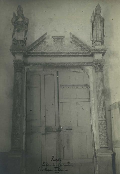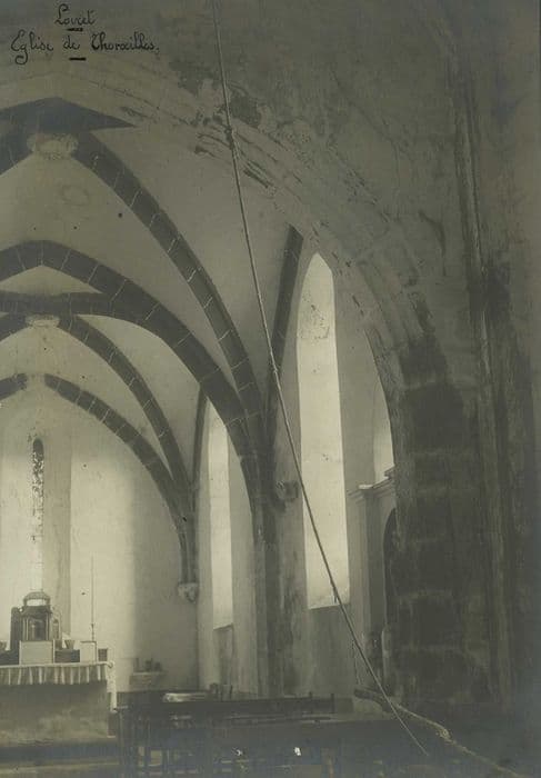 Nef unique. Chevet plat. Voûtes du choeur en maçonnerie avec arcs en pierre. Restes d'armoiries sur les clés de voûtes.