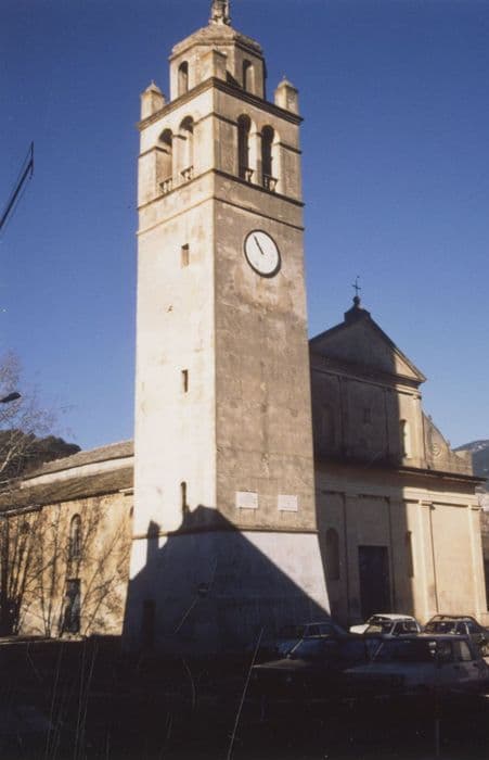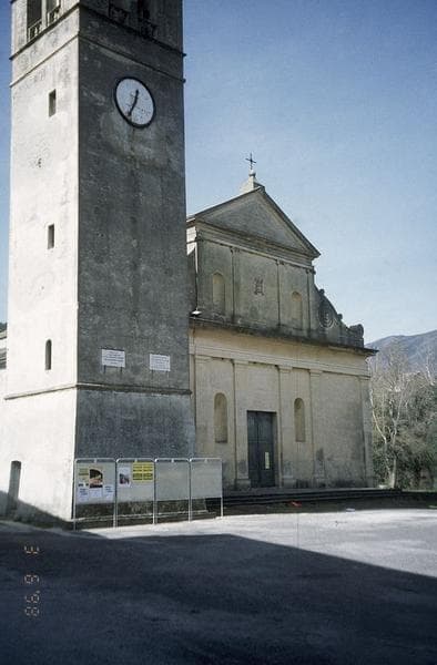 Ancienne église piévane érigée à la fin du 16e ou au début du 17e siècle, sans doute à l'emplacement d'une église médiévale. En 1751, l'église est érigée en collégiale par le pape Benoît XIV. Le curé porte alors le titre d'archiprêtre. En 1793, la collégiale est supprimée. Des travaux d'agrandissement ont été entrepris à partir de 1836 (sacristie, collatéral) , mais ont été suspendus faute de ressources. ££L'église baroque présente une élévation antérieure à deux niveaux, scandée de pilastres, ornée de quatre niches et surmontée d'un fronton triangulaire. L'édifice se termine par un chevet polygonal. Le clocher s'élève au sud, accolé à l'édifice. De plan carré et à cinq étages, il daterait de 1595. L'intérieur se compose d'une nef séparée de ses deux collatéraux par des arcs en plein cintre. La voûte est ornée de peintures en trompe l'oeil. Six chapelles s'ouvrent sur les collatéraux. La demi-voûte à arêtes du choeur est ornée de peintures sur fond doré.