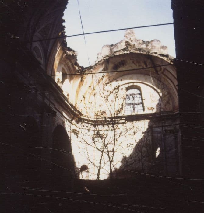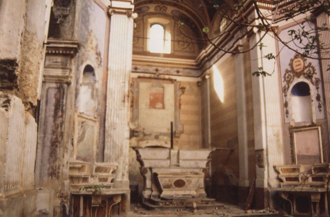 L'église est déjà mentionnée au 17e siècle, sans précision de date de construction. L'église baroque présente, à l'est, une élévation antérieure à deux niveaux séparés par une épaisse corniche et couronnée par un fronton à volutes. Elle est scandée de pilastres. L'édifice se termine par un chevet plat. Au sud se trouve un clocher carré percé de quatre baies et couronné d'une coupole surmontée d'une croix. La nef était ornée de stuc doré et comprenait quatre chapelles latérales. L'édifice a été restauré en 1853-1854.£