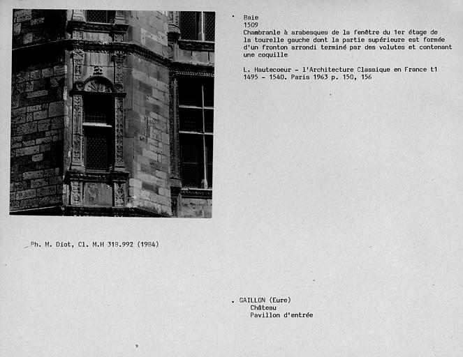 "Château : 18 04 1914 (J.O.). La propriété de l'Etat est limitée par rapport au domaine (château et anciens jardins) ; les parties classées appartiennent également à la commune et les parties inscrites appartiennent soit aux communes de Gaillon ou Aubevoye, soit à des propriétaires privés.