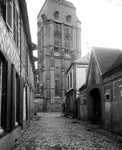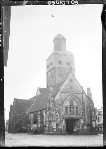 Eglise endommagée par faits de guerre, rayée de la liste des MH classés le 07 01 1952 (arrêté) , sauf clocher et mur occidental.