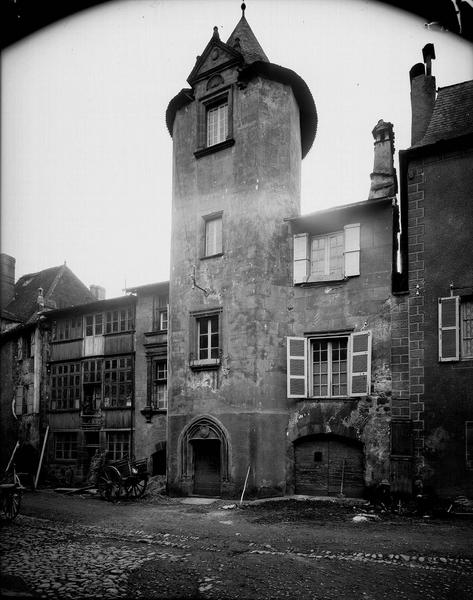 Tourelle carrée à pan coupé avec escalier à vis. Porte d'entrée 15e siècle. Croisée à fronton et coquille. Grande croisée à pilastres et meneaux Renaissance.