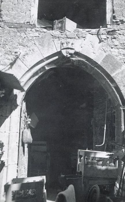 Porte en ogive, moulurée, base gothique. Clé sculptée aux armes de la ville.