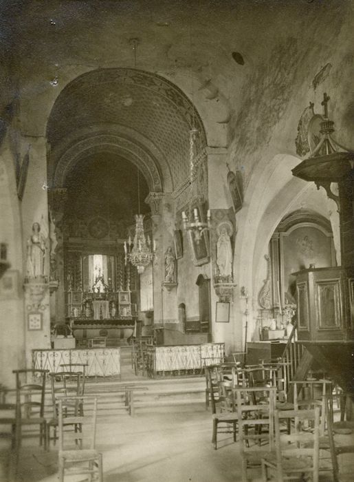 Eglise de la fin du 12e siècle, comprenant une nef à laquelle fut ajoutée postérieurement une chapelle de chaque côté du choeur voûté en berceau. La nef a été très remaniée. Le portail d'entrée est du 13e siècle et supporte un clocher volumineux du 12e siècle dont l'étage octogone et la flèche (18e siècle) sont constitués par une charpente habillée d'ardoises. Quatre faces de l'octogone sont ajourées par des baies à trois divisions encadrées de zinc. L'abside est à cinq pans. Les colonnes de l'arc triomphal ont conservé leurs chapiteaux sculptés. Corniches à modillons historiés.