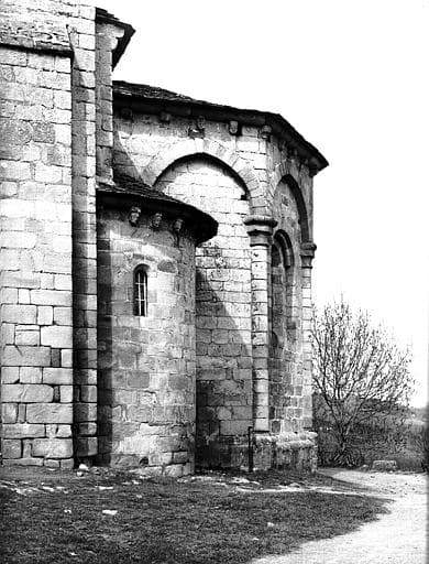 Eglise romane avec transept à absidioles, clocher carré sur coupole. Abside à pans coupés dont les angles sont ornés de colonnettes à chapiteaux.