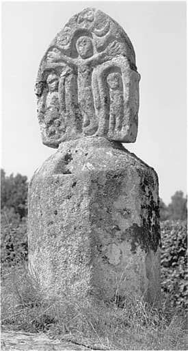 Croix (mérovingienne ?) constituée d'un bloc de pierre épais, semi losangique, au centre duquel est gravée en fort relief la silhouette du Christ en croix.