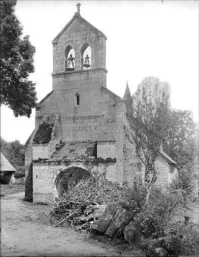 Primitivement, l'église ne comprenait qu'une nef terminée par un choeur à trois pans. L'abside, la façade nord et le portail sont de la fin du 12e siècle. Ce portail est abrité d'un porche. Au début du 15e siècle, le mur sud s'étant écarté sous la poussée de la voûte probablement en berceau plein cintre, cette dernière s'écroula et fut remplacée par la voûte actuelle. A la même époque, un clocher-pignon a deux arcades fut élevé sur la façade. Les deux chapelles qui forment, en plan, figure de transept, et les chapelles de la nef datent également du 15e siècle. Dans le cimetière, croix de pierre polychromée abritée sous un auvent.