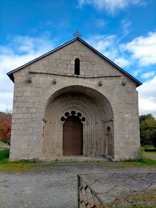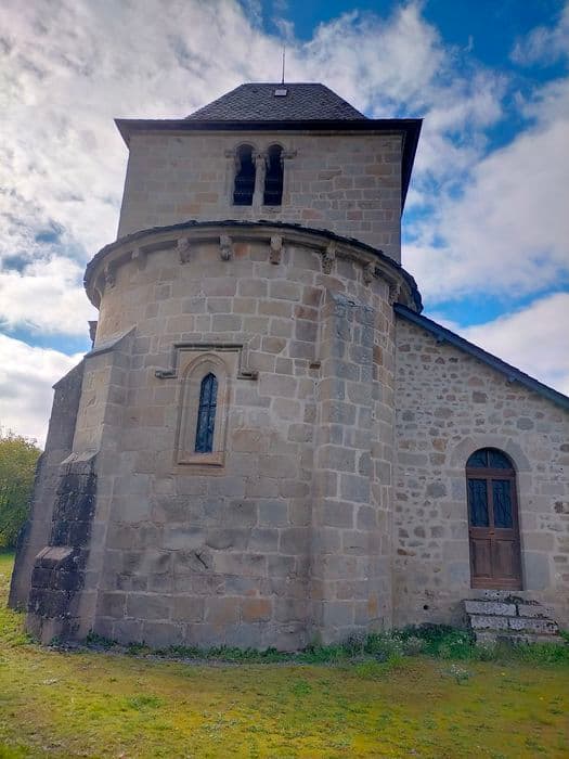 Eglise présentant un caractère assez nettement auvergnat. Proche de la grande voie transversale Clermont-Toulouse-Bordeaux, l'architecture de cette église a reçu les influences méridionales et auvergnates. Le sanctuaire se compose d'une nef unique, d'un choeur et d'une abside semi circulaire voûtée en cul de four. Un arc triomphal plein cintre à double rouleau sépare la travée précédente de l'abside. Cet arc repose sur des colonnes aux chapiteaux décorés d'animaux fantastiques. Portail polylobé appareillé que protège un porche massif et profond. L'édifice est roman, probablement du 12e siècle. La baie axiale que surmonte un larmier semble dater du gothique tardif. De plan barlong et de proportions massives, le clocher à un étage est percé d'arcatures géminées avec de curieux chapiteaux. Les chapelles latérales sont des additions modernes.